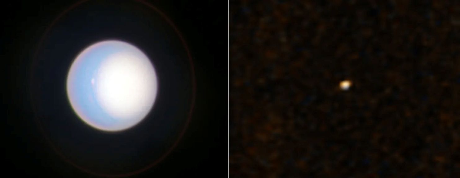 On the other hand, Hubble, with its high resolution, and in its low-Earth orbit 1.7 billion miles away from Uranus, was able to see atmospheric features such as clouds and storms on the day side of the gaseous world.