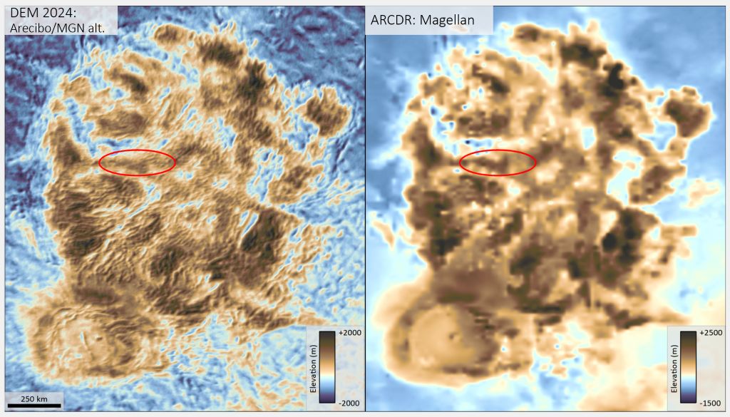 Between 1990 and 1994, NASA’s Magellan spacecraft used radar imaging and altimetry to map the topography of Alpha Regio from Venus’ orbit. Recently, NASA’s DAVINICI’s team sought more detail from these maps, so scientists applied new techniques to analyze Magellan’s radar altimeter data. They then supplemented this data with radar images taken on three occasions from the former Arecibo Observatory in Puerto Rico and used machine vision computer models to scrutinize the data and fill in gaps in information at new scales (less than 0.6 miles, or 1 kilometer).