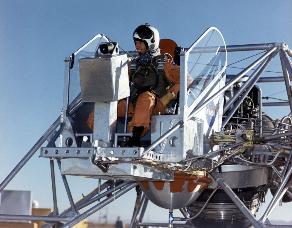 NASA pilot Joe Walker sits in the pilot’s platform of the Lunar Landing Research Vehicle (LLRV) number 1 on Oct. 30, 1964. The LLRV and its successor the Lunar Landing Training Vehicle (LLTV) provided the training tool to simulate the final 200 feet of the descent to the Moon’s surface.