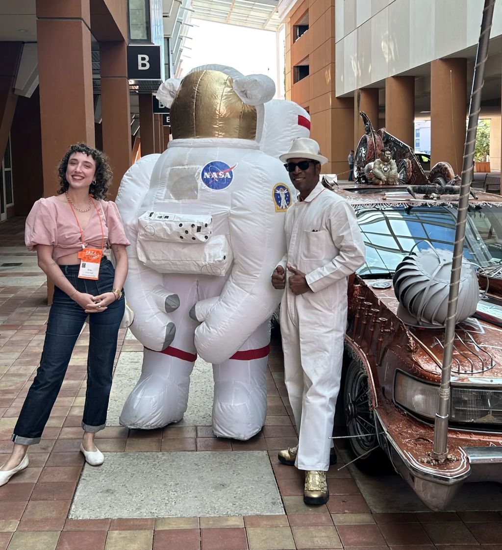 NASA’s inflatable mascot, Cosmo, greets attendees and poses for photos during the art car show at the conference.