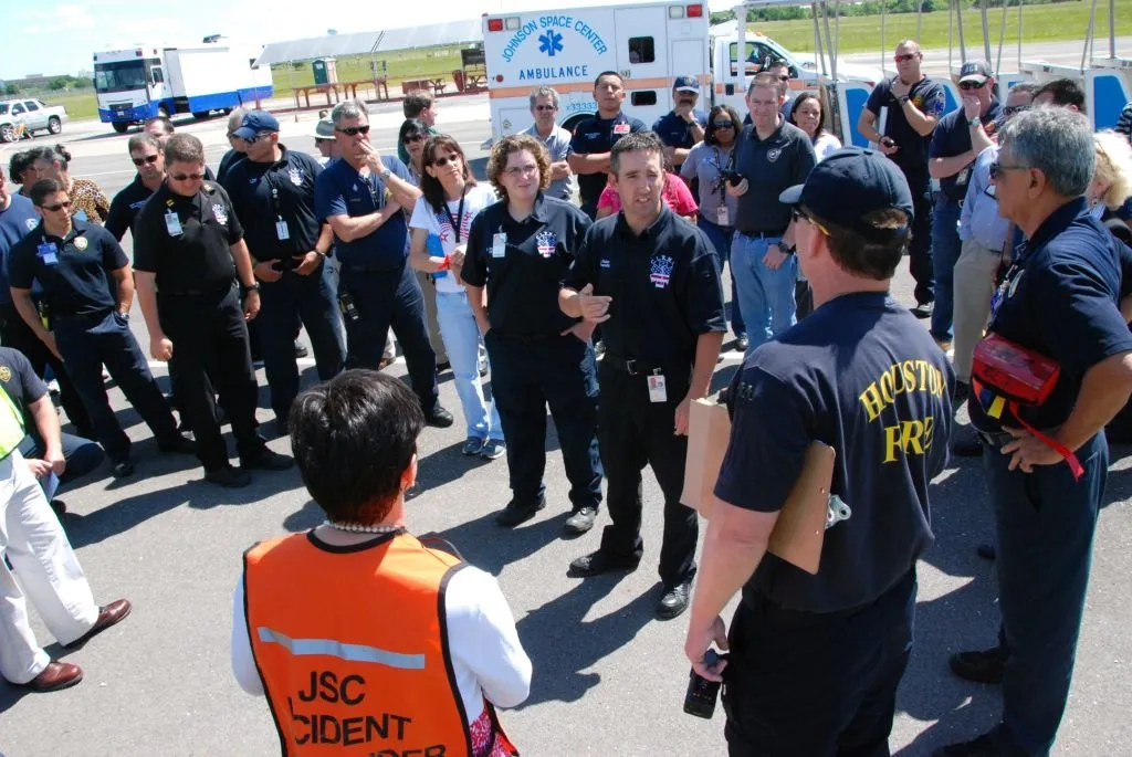 NASA’s Johnson Space Center Emergency Manager Linda Spuler, front, leads an emergency exercise for first responders.