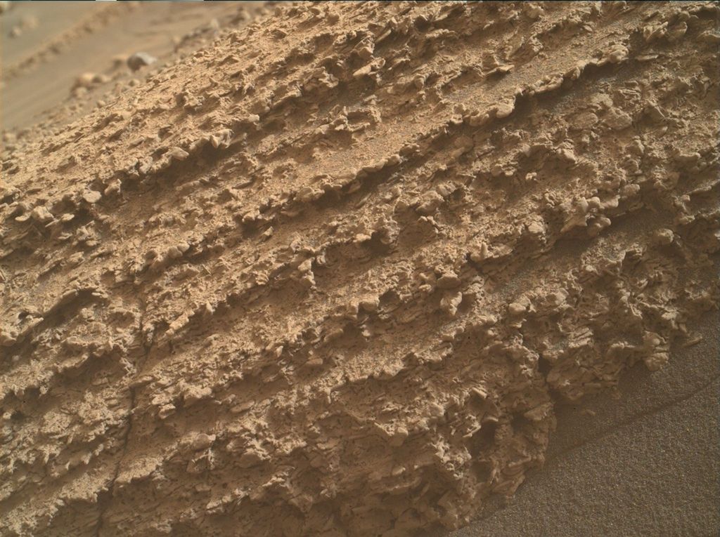 Before the science team starts planning, we first look at the latest Navcam image downlinked from Curiosity to see where the rover is located. It can be all too easy to get lost in the scenery of the Navcam and find new places in the distance we want to drive towards, but there’s so much beauty in the smaller things. Today I’ve chosen to show a photo from Curiosity’s hand lens camera, MAHLI, that takes photos so close that we can see the individual grains of the rock.