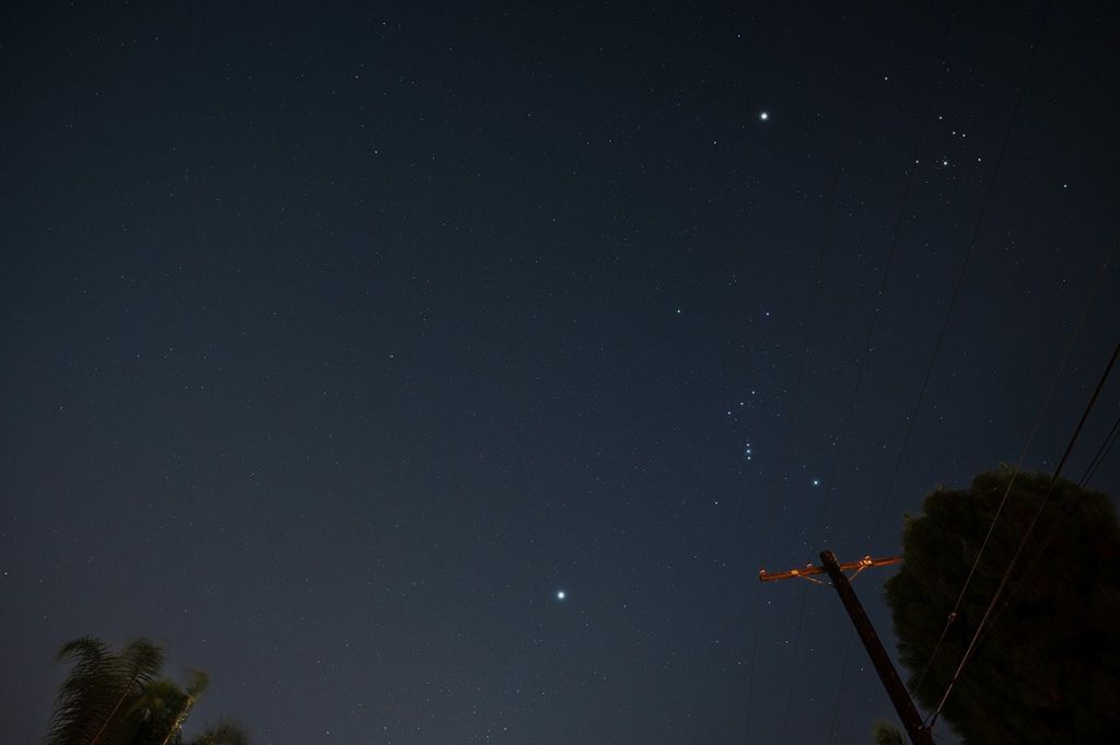 In late 2024, Jupiter could be found high overhead as dawn approached with the bright stars of Taurus and Orion. (Jupiter is the bright object at top, right of center.)