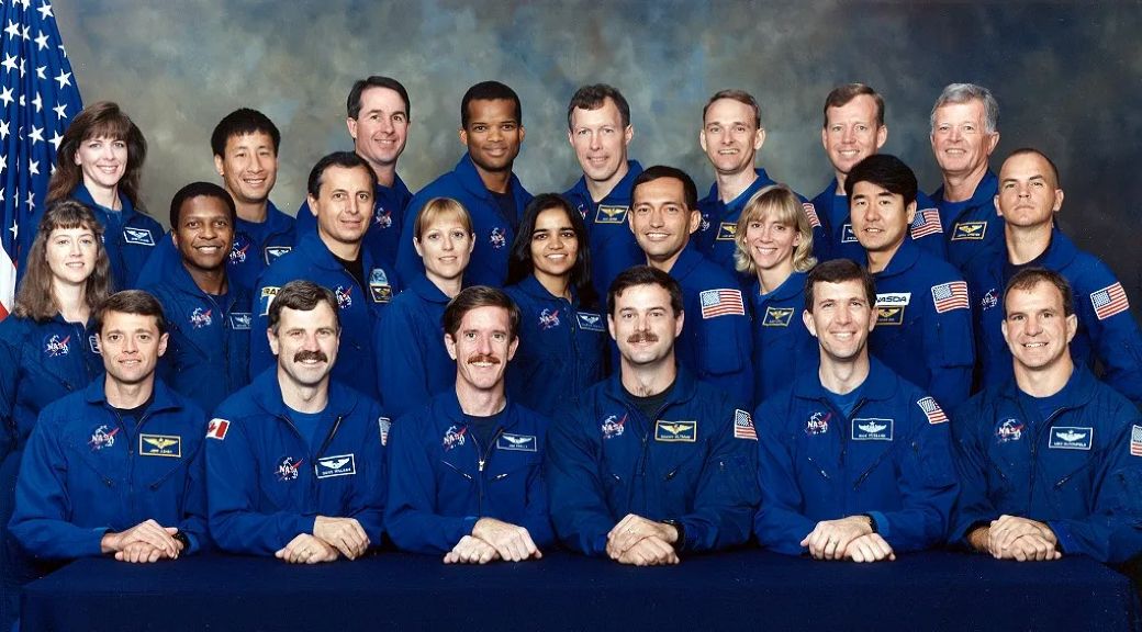 The Group 15 NASA and international astronaut candidates pose for a group photo – front row, Jeffrey S. Ashby, left, Dafydd “Dave” R. Williams, James F. Reilly, Scott D. Altman, Rick D. Husband, and Michael J. Bloomfield; middle row, Pamela A. Melroy, left, Michael P. Anderson, Michel Tognini, Kathryn “Kay” P. Hire, Kalpana Chawla, Carlos I. Noriega, Susan L. Still, Takao Doi, and Frederick “Rick” W. Sturckow; back row, Janet L. Kavandi, left, Edward T. Lu, Steven K. Robinson, Robert L. Curbeam, Dominic L.P. Gorie, Joe F. Edwards, Steven W. Lindsey, and Jean-Loup Chrétien.