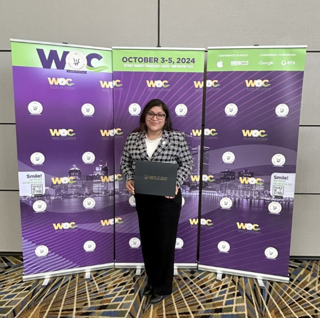 Michelle Dominguez proudly displays her award at the Women of Color STEM Conference in Detroit, Michigan, October 2024.