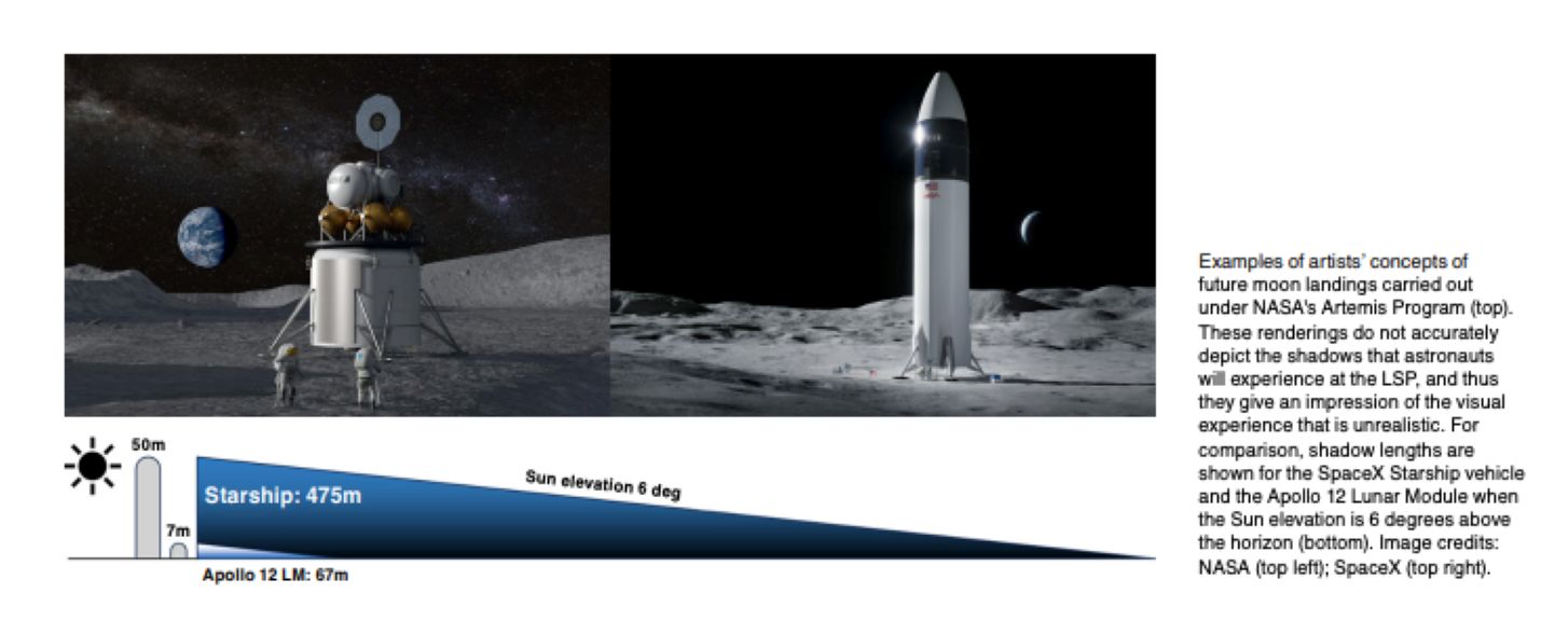 Humans are returning to the Moon—this time, to stay. Because our presence will be more permanent, NASA has selected a location that maximizes line-of-sight communication with Earth, solar visibility, and access to water ice: the Lunar South Pole (LSP). While the Sun is in the lunar sky more consistently at the poles, it never rises more than a few degrees above the horizon; in the target landing regions, the highest possible elevation is 7°. This presents a harsh lighting environment never experienced during the Apollo missions, or in fact, in any human spaceflight experience. The ambient lighting will severely affect the crews’ ability to see hazards and to perform simple work. This is because the human vision system, which despite having a high-dynamic range, cannot see well into bright light and cannot adapt quickly from bright to dark or vice versa. Functional vision is required to perform a variety of tasks, from simple tasks (e.g., walking, operating simple tools) through managing complex machines (e.g., lander elevator, rovers). Thus, the environment presents an engineering challenge to the Agency: one that must be widely understood before it can be effectively addressed.