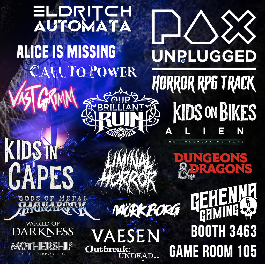 | Game Room 105 will feature:Eldritch Automata (Gehenna Gaming) – Organized play and learn-to-play sessionsAlice is Missing, Kids in Capes, and Kids on Bikes (Hunters Entertainment) Organized play sessionsCall to Power (Hedron) – Organized play and learn-to-play sessionsVast Grimm (Creature Curation) – Organized playOur Brilliant Ruin (Studio Hermitage) – Organized play Horror D&D featuring The Red Opera and The Black Ballad (Storytellers Forge) – Organized playLiminal Horror (Goblin Archives) – Organized playOutbreak Undead and Gods of Metal: Ragnarock (Hunters Entertainment) – Learn-to-playSunset (Forteller Games) – Demos run by developer Mike TomasekOnSlaughter (Oneiroscope Games) – Demos run by developer Talia DeanIn addition, Gehenna Gaming is running organized play sessions for World of Darkness, ALIEN, Vaesen, MÖRK BORG, Mothership, and Delta Green. View the full Gehenna Gaming schedule |