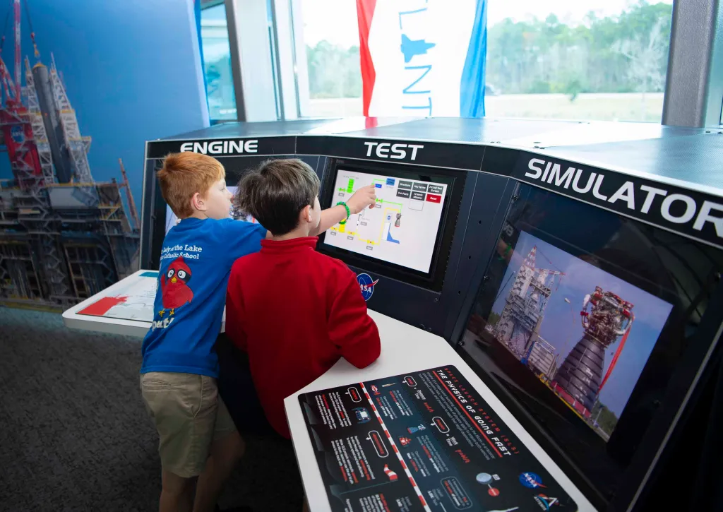 The engine test simulator exhibit at the official visitor center of NASA Stennis provides the chance to experience the thrill of being a NASA test engineer by guiding an RS-25 engine through a simulated hot fire test.