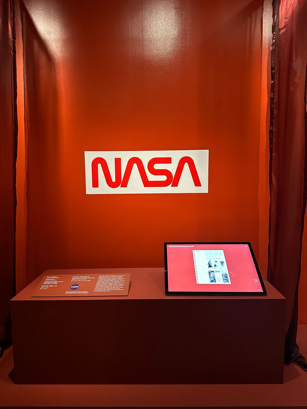 MoMA accessioned the logotype for its permanent collection, as well as the original NASA Graphics Standards Manual published in 1976, also gifted by NASA. The exhibit also includes a letterform sketch of the NASA worm gifted by the Bruce Blackburn Estate.