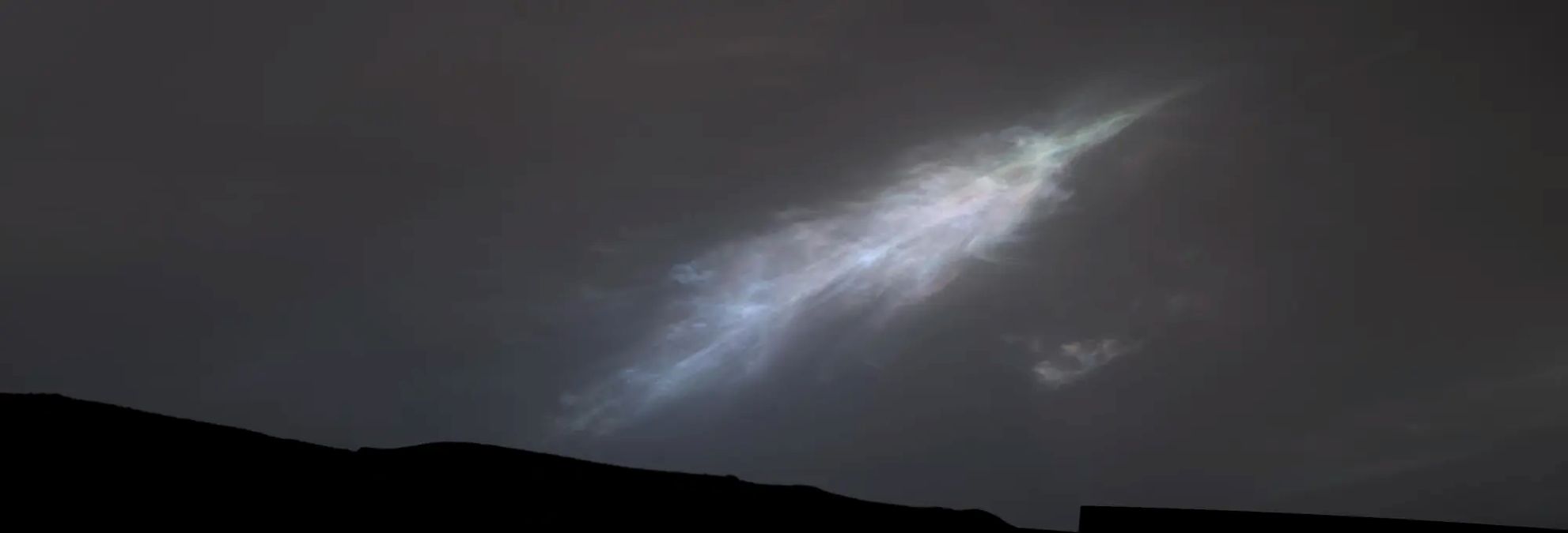 NASA’s Curiosity Mars rover captured this feather-shaped iridescent cloud just after sunset on Jan. 27, 2023. Studying the colors in iridescent clouds tells scientists something about particle size within the clouds and how they grow over time. These clouds were captured as part of a seasonal imaging campaign to study noctilucent, or “night-shining” clouds. A new campaign in January 2025 led to Curiosity capturing this video of red- and green-tinged clouds drifting through the Martian sky.
