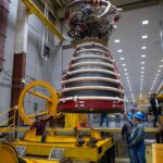 Engineers at NASA’s Kennedy Space Center in Florida completed stacking the twin SLS (Space Launch System) solid rocket boosters – seen in this Feb. 19, 2025, photo – inside the Vehicle Assembly Building for the agency’s Artemis II crewed test flight around the Moon.