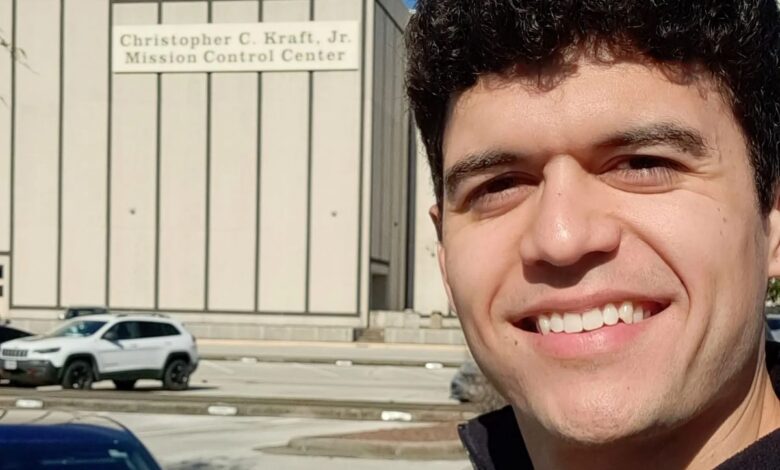 Jorge Chong in front of the Mission Control Center at NASA’s Johnson Space Center in Houston when he helped with optical navigation operations during Artemis I.