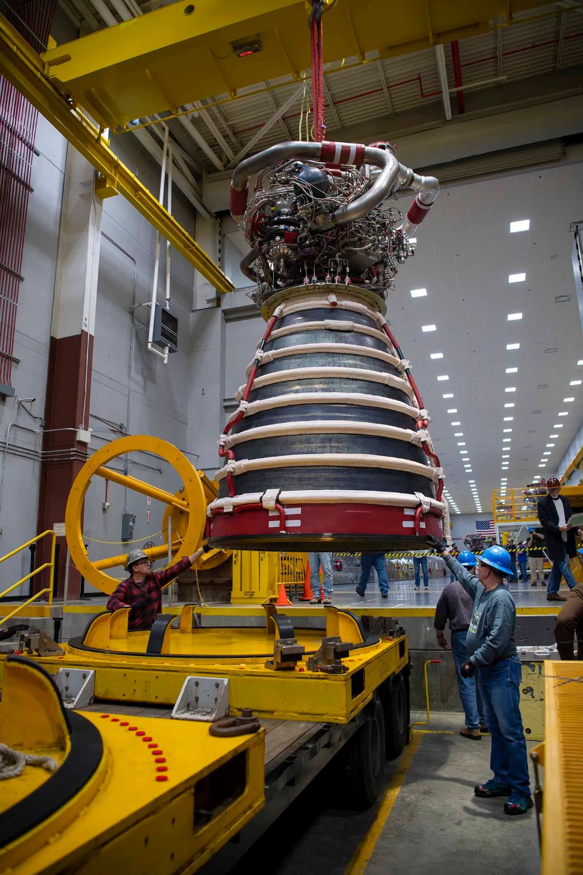 The engine arrived at the test stand from the L3Harris Engine Assembly Facility on the engine transport trailer before being lifted onto the vertical engine installer (VEI) on the west side deck. After rolling the engine into the stand, the team used the VEI to raise and secure it in place.