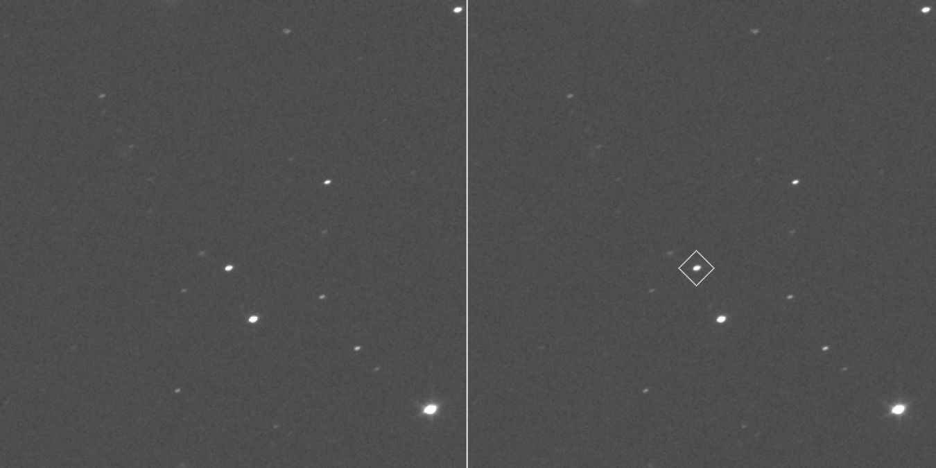 NASA’s Lucy spacecraft’s first views of the asteroid Donaldjohanson. The asteroid is outlined with a square in the right image to guide the eye.