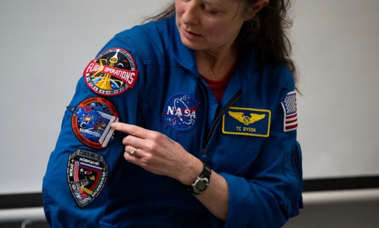 NASA Astronaut Tracy Dyson points to the Expedition 71 patch on her flight suit on Wednesday, March 5, 2025. Dyson and her fellow Expedition 71 crewmates Matthew Dominick, Michael Barratt, and Jeanette Epps answered questions from students at Elsie Whitlow Stokes Community Freedom Public Charter School in Washington.