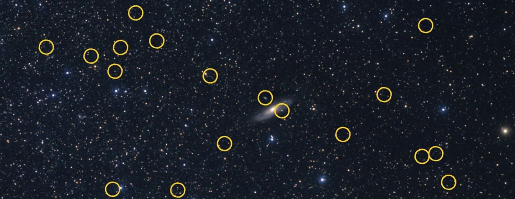 This is a wide-angle view of the distribution of known satellite galaxies orbiting the large Andromeda galaxy (M31), located 2.5 million light-years away. The Hubble Space Telescope was used to study the entire population of 36 mini-galaxies circled in yellow. Andromeda is the bright spindle-shaped object at image center. All the dwarf galaxies seem to be confined to a plane, all orbiting in the same direction. The wide view is from ground-based photography. Hubble’s optical stability, clarity, and efficiency made this ambitious survey possible. Hubble close up snapshots of four dwarf galaxies are on image right. The most prominent dwarf galaxy is M32 (NGC 221), a compact ellipsoidal galaxy that might be the remnant core of a larger galaxy that collided with Andromeda a few billion years ago.