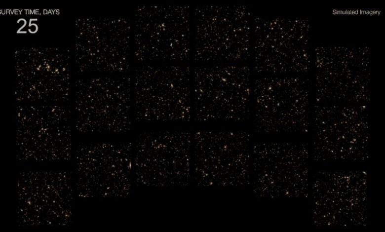 This animation shows a possible tiling pattern of part of NASA’s Nancy Grace Roman Space Telescope’s High Latitude Time-Domain Survey. The observing program, which is being designed by a community process, is expected to have two components: wide (covering 18 square degrees, a region of sky as large as about 90 full moons) and deep (covering about 5.5 square degrees, about as large as 25 full moons). This animation shows the deeper portion, which would peer back to when the universe was about 500 million years old, less than 4 percent of its current age of 13.8 billion years.