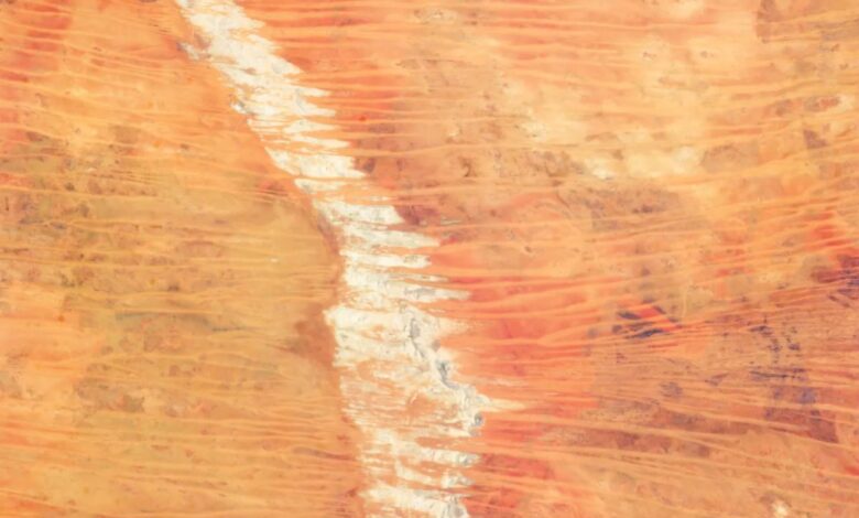 On March 25, 2013, an astronaut aboard the International Space Station took this photo of the Great Sandy Desert in northwest Australia, showcasing linear dunes separated in a roughly regular fashion. When you fly over such dune fields—either in an airplane or the space station—the fire scars stand out. Where thin vegetation has been burned, the dunes appear red from the underlying sand; dunes appear darker where the vegetation remains.
