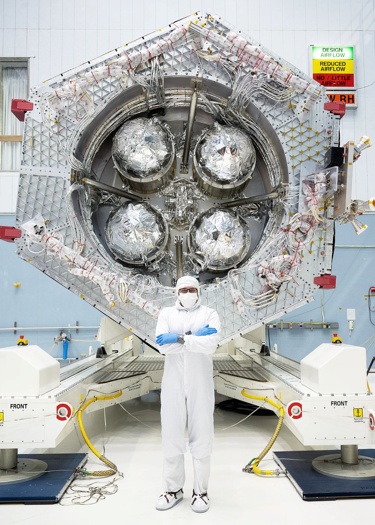 Mike Drury, the deputy integration and testing manager for NASA’s Nancy Grace Roman Space Telescope, stands inside a clean room in front of Roman’s primary support structure and propulsion system. The “bunny suit” that he’s wearing protects the telescope from contaminants like dust, hair, and skin.