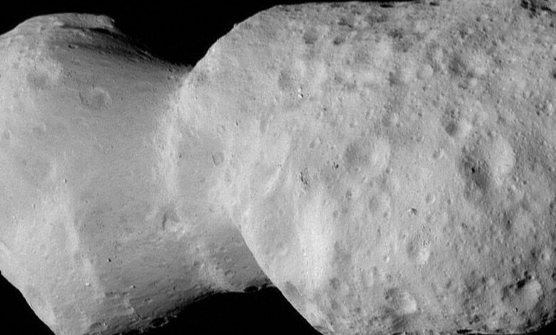 NASA’s Lucy spacecraft took this image of the main belt asteroid Donaldjohanson during its flyby on April 20, 2025, showing the elongated contact binary (an object formed when two smaller bodies collide). This was Lucy’s second flyby in the spacecraft’s 12-year mission.
