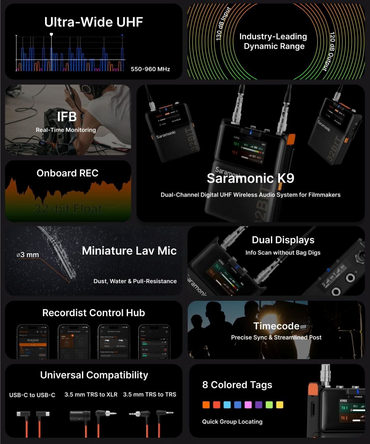 Saramonic launches Saramonic K9, its first dual-channel digital UHF wireless audio system for filmmakers during NAB Show 2025. This new system features what a professional looks for in a reliable audio system: ultra-wide 550-960 MHz digital UHF, 130 dB high dynamic range, 32-bit float onboard recording*, and timecode, giving filmmakers a friendlier user experience.