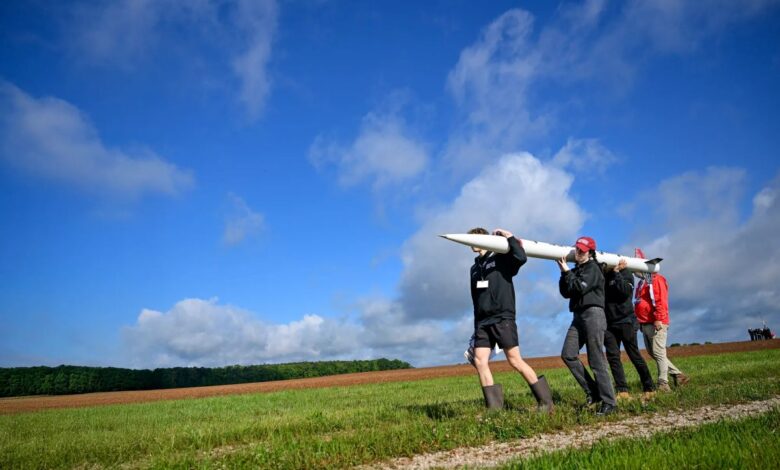 Students from the University of Massachusetts Amherst team carry their high-powered rocket toward the launch pad at NASA’s 2025 Student Launch launch day competition in Toney, Alabama, on May 4, 2025. More than 980 middle school, high school, and college students from across the nation launched more than 40 high-powered amateur rockets just north of NASA’s Marshall Space Flight Center in Huntsville, Alabama. This year marked the 25th anniversary of the competition.
