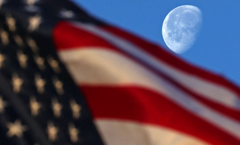 Just after sunrise, the waning gibbous moon sets just behind a waving United States flag on March 19, 2025, in this image from NASA’s Michoud Assembly Facility in New Orleans. The waning gibbous moon phase comes after the full moon. As the Moon begins its journey back toward the Sun, the opposite side of the Moon now reflects the Moon’s light. The lighted side appears to shrink, but the Moon’s orbit is simply carrying it out of view from our perspective. The Moon also rises later and later each night.