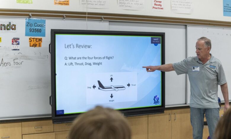 Gary Laier, center liaison for the Small Business Innovation Research/Small Business Technology Transfer (SBIR/STTR) program at NASA’s Armstrong Flight Research Center in Edwards, California, teaches students about aeronautics during Aero Fair at Tropico Middle School in Rosamond, California, on April 9, 2025.