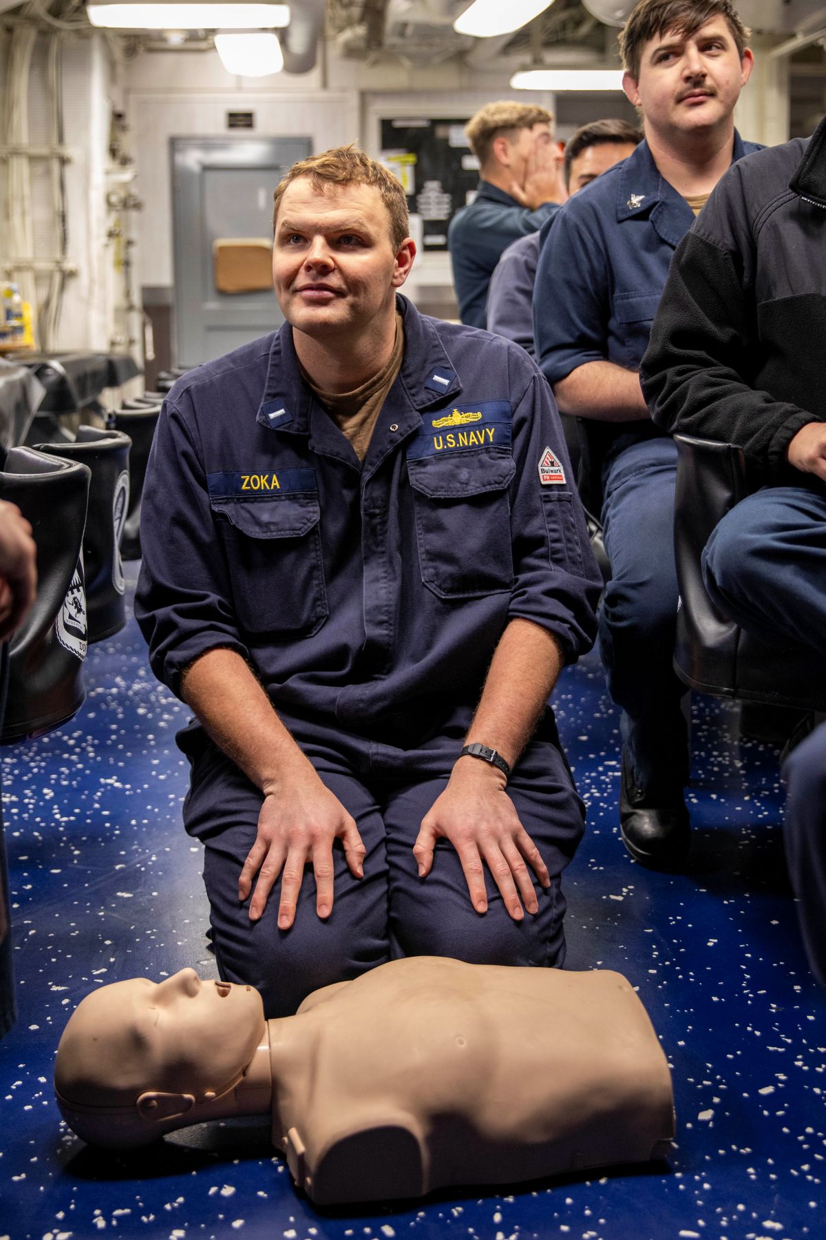 NORTH PACIFIC OCEAN (May 6, 2025) Lt. j.g. Brad Zoka, from Pittsburgh, participates in a CPR class on the mess decks of the Arleigh Burke-class guided-missile destroyer USS Preble (DDG 88) in the North Pacific Ocean, May 6. Preble is forward deployed and assigned to Destroyer Squadron (DESRON) 15, the Navy’s largest DESRON and the U.S. 7th Fleet’s principal surface force. (U.S. Navy photo by Mass Communication Specialist 1st Class Jamaal Liddell)