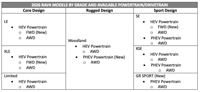 The 2026 RAV4 puts choice at the center of its model lineup. For instance, FWD is available on hybrid LE, XLE, and SE grades for the first time, and the previously available AWD system is offered on all grades. The following combinations will be available: