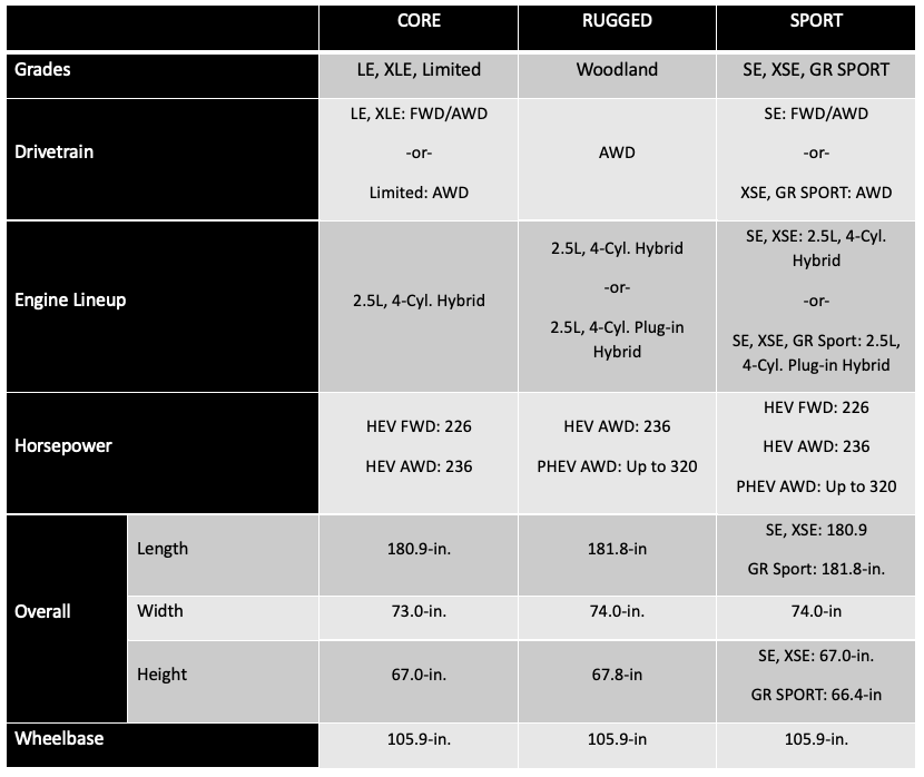 The latest PHEV system also adds output, with up-to an impressive 320 combined system net horsepower, up 18 hp over the outgoing system. Variety is also the name of the game for PHEV models, moving from two to four grades in model year 2026, with the Woodland and GR SPORT models joining the previously available SE and XSE. All PHEV models will have standard AWD. The PHEV model also increases its all-electric driving range to a manufacturer’s estimated 50-mile range rating. The PHEV XSE and Woodland grades will have DC fast charging, capable of charging from 10% to 80% in approximately 30 minutes*.