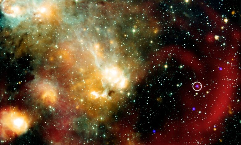 An unusual star (circled in white at right) behaving like no other seen before and its surroundings are featured in this composite image released on May 28, 2025. A team of astronomers combined data from NASA’s Chandra X-ray Observatory and the Square Kilometer Array Pathfinder (ASKAP) radio telescope on Wajarri Country in Australia to study the discovered object, known as ASKAP J1832−0911 (ASKAP J1832 for short).