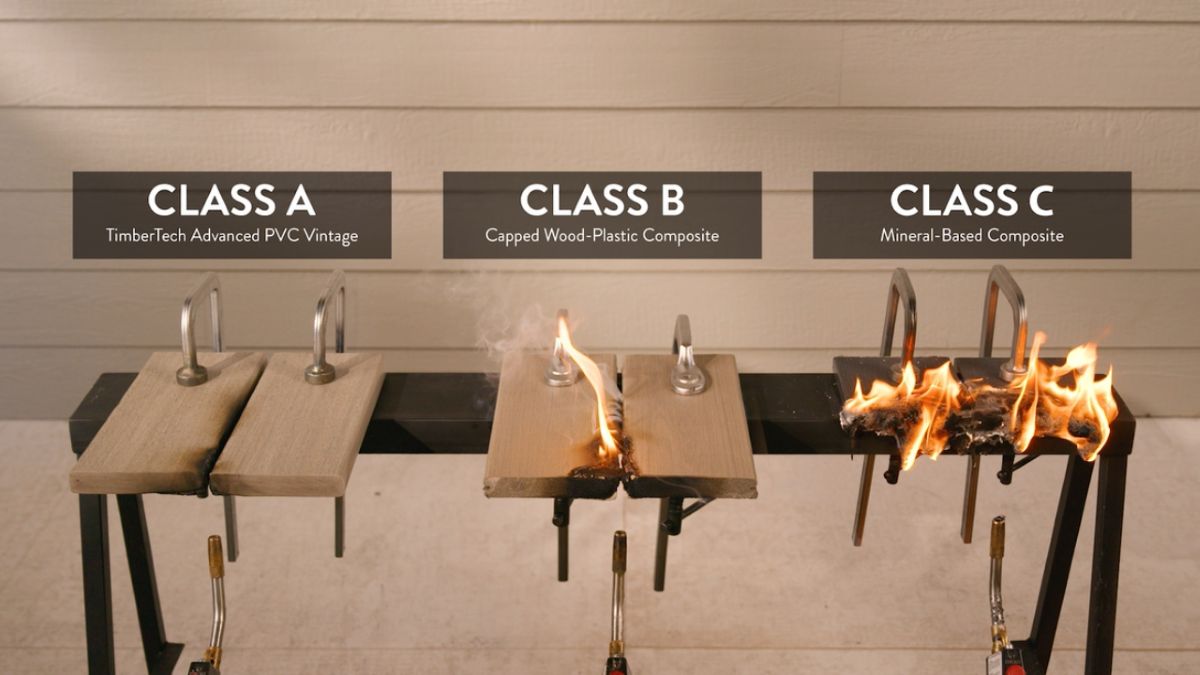 The controlled-environment video features the TimberTech Advanced PVC Vintage Collection, which holds a Class A Flame Spread Rating, and demonstrates its performance under direct flame exposure compared to two competitor decking products with lower flame spread ratings – a Class B capped wood-plastic composite and a Class C mineral-based composite. The results clearly demonstrate TimberTech’s Vintage Collection’s superior resistance to ignition and flame spread, highlighting its value not only for fire-conscious and climate-sensitive design, but also for everyday peace of mind—helping protect outdoor spaces from accidental ignition sources like grills or stray embers from firepits.