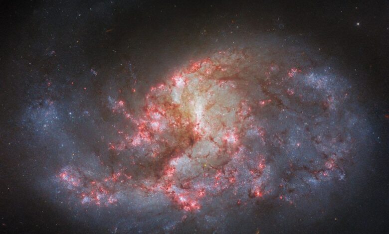 This NASA/ESA Hubble Space Telescope image features a luminous tangle of stars and dust called the barred spiral galaxy NGC 1385, located about 30 million light-years away. Hubble released an earlier image of NGC 1385, but the two images are notably different. This more recent image has far more pinkish-red and umber shades, whereas cool blues dominate the earlier image. This chromatic variation is not just a creative choice, but also a technical one, that represents the different number and types of filters used to collect the data that comprises the respective images.