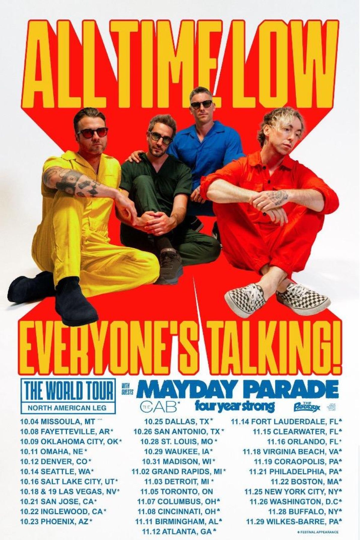 All Time Low head out on tour this fall for a just-announced nationwide headline run. Produced by Live Nation, their EVERYONE’S TALKING! TOUR will make a stop at UPMC Events Center in Moon Township, PA, on November 19, with support from special guests Mayday Parade, The Cab, Four Year Strong, and The Paradox across select cities.