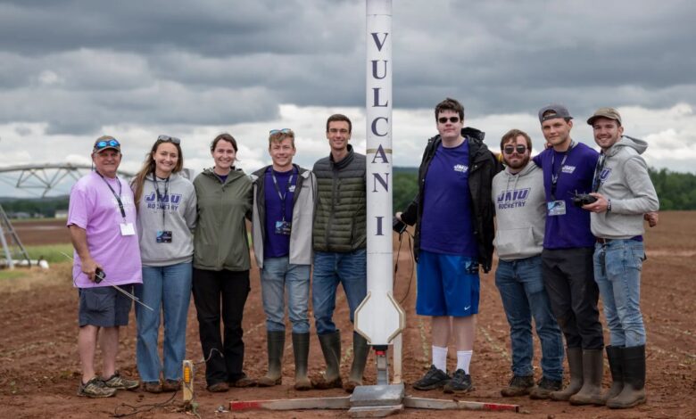 Participants from James Madison University – the overall winner of the 2025 NASA Student Launch competition – stand around their team’s high-powered rocket as it sits on the pad before launching on May 4 event.