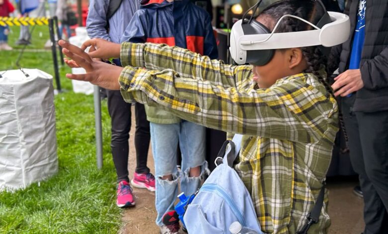 At COSI’s Big Science Celebration on Sunday, May 4, 2025, a young visitor steps out of the rain and into NASA Glenn Research Center’s booth to check out the Graphics and Visualization Lab’s augmented reality fluid flow table that allows users to virtually explore a model of the International Space Station.