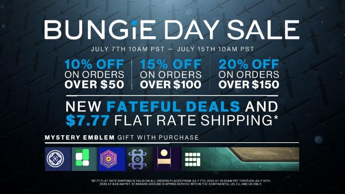 To sweeten the deal, a mystery Destiny 2 emblem will be granted with every purchase, pulled from a curated pool of classic Bungie Store designs. Among them is Lockbox, a new Destiny 2 emblem, with limited quantities, making this drop a rare collector’s moment. Shipping will also be discounted, with a $7.77 flat rate available for all orders within the continental US, EU, and UK*.