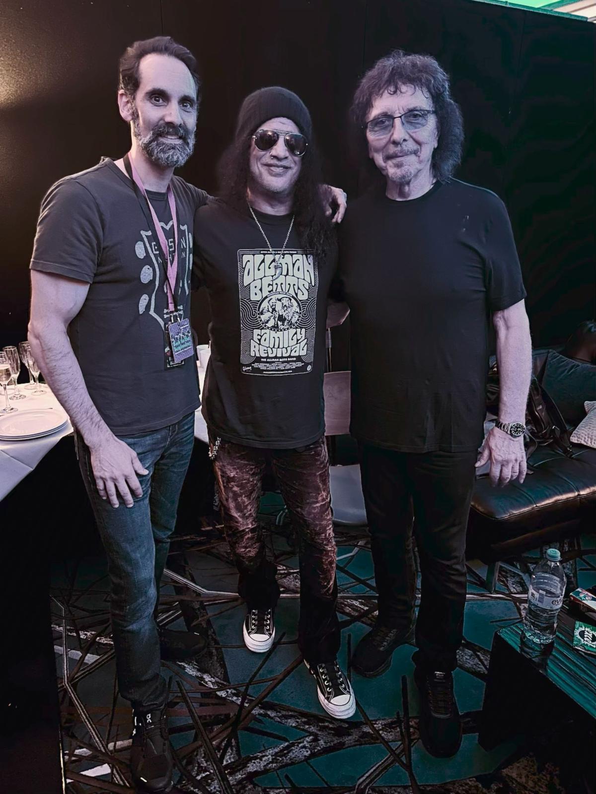 | Cesar Gueikian (President and CEO of Gibson), Slash, and Tony Iommi at Back to the Beginning. |