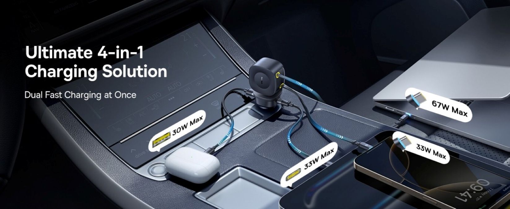 A 4-in-1 100W Charging Solution: One of the biggest highlights of the PrimeTrip VR2 Max 100W Car Charger is definitely the absolute scale of power and usage. This versatile charging solution comes with 4 different charging ports: A 67W USB-C1 cable, a 33W USB-C2 cable, a 33W USB-C port, and a 30W USB-A port. These each serve a specific purpose and can be used respectively to charge different devices at the same time. Equipped with a hefty 100W maximum output, speed and power are no problem for the PrimeTrip VR2 Max 100W Car Charger. When using multiple ports simultaneously, the USB-C1 port will maintain a 67W output to charge high-power devices such as laptops.