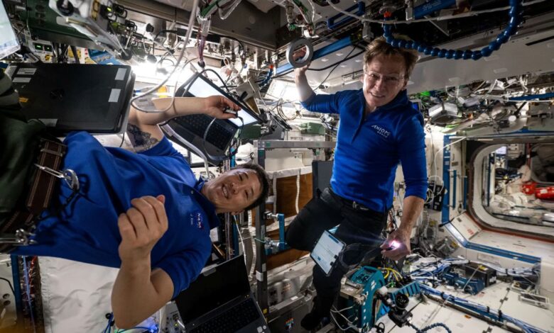 In this photo from June 28, 2025, Expedition 73 flight engineer Jonny Kim and former NASA astronaut and director of human spaceflight at Axiom Space Peggy Whitson work together inside the International Space Station’s Destiny laboratory module setting up hardware for cancer research.