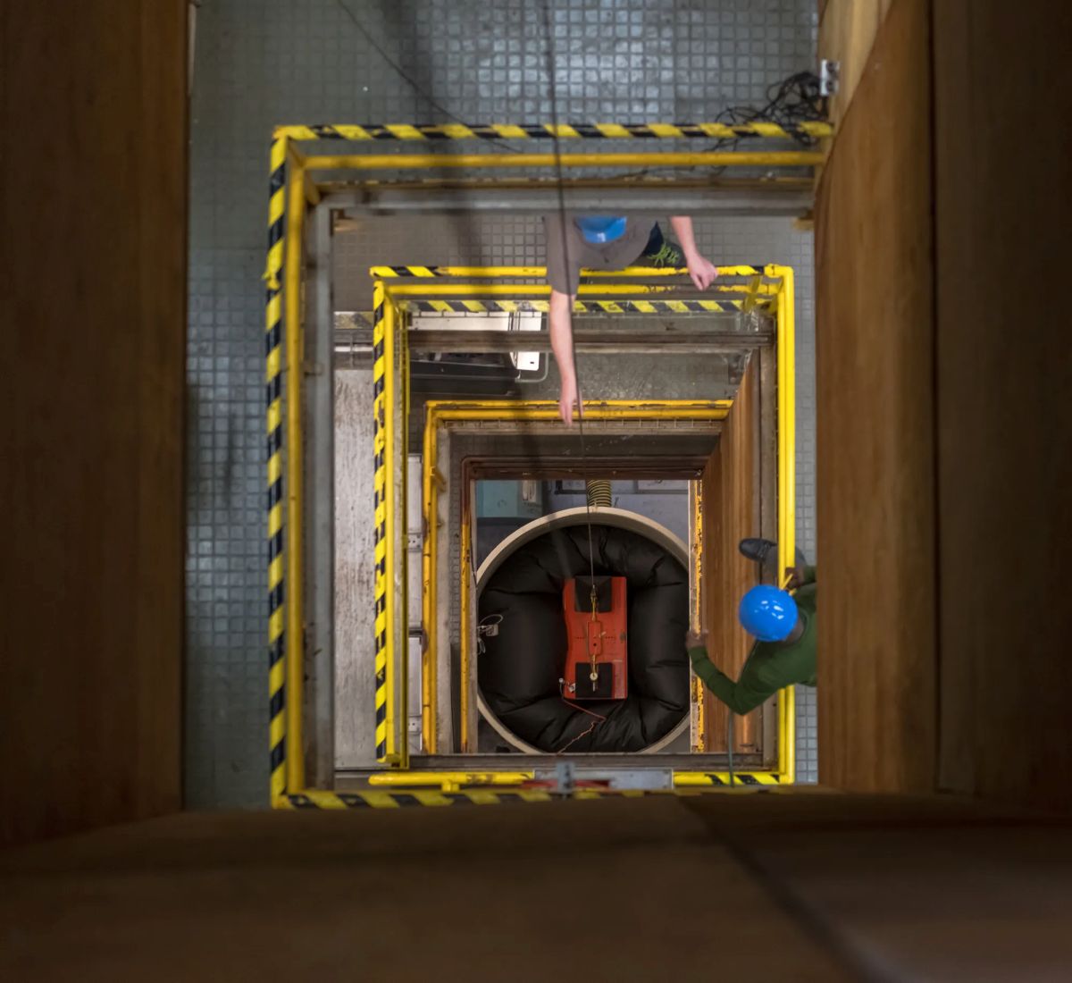 On Thursday, May 6, 2025, NASA Glenn Research Center technicians — left to right, John Doehne, Jason West, and Moses Brown — prepare the 2.2. Second Drop Tower for testing student experiments during the 2025 Drop Tower Challenge.