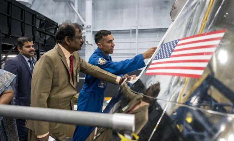 NASA astronaut Raja Chari and Dr. V. Narayanan, chairman of ISRO (Indian Space Research Organisation), interact outside the Orion spacecraft mockup at NASA’s Johnson Space Center in Houston. Narayanan and Indian officials visited NASA Johnson and NASA’s Kennedy Space Center in Florida, ahead of the Axiom Mission 4 launch to the International Space Station.