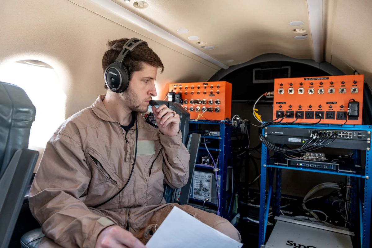 Experimental communications equipment is secure and ready for flight test evaluation in the back of NASA’s Pilatus PC-12 at NASA’s Glenn Research Center in Cleveland on April 17, 2025.