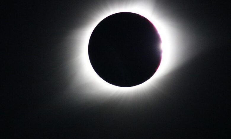 The reddish chromosphere is visible on the Sun’s right edge in this view of the Aug. 21, 2017, total solar eclipse from Madras, Oregon.