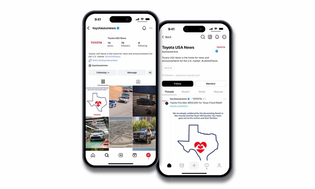 Toyota USA News, the latest way to stay up to date on all breaking Toyota news, officially launched on Instagram and Threads today. Followers can easily track the latest press announcements from Toyota on the new channels, making it easy to share, like, and engage with every post. Stay up to date with product reveals and announcements, company updates and more, straight from Instagram and Threads.