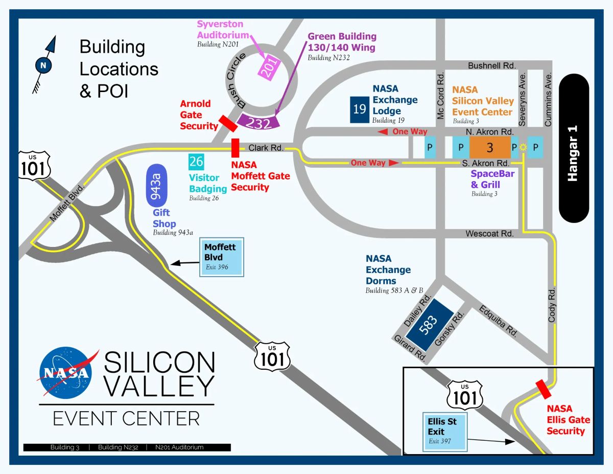 Inside the NASA security fence, at building N232 and the N201 Syverston Auditorium, there is very little parking available and it is first-come first-serve. We highly recommend walking or carpooling to these locations if you are attending an event in either of them