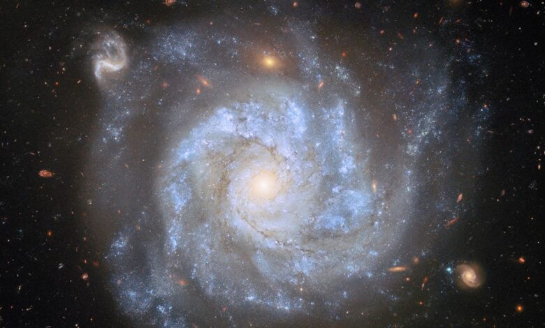 This stunning Hubble image encompasses NGC 1309’s bluish stars, dark brown gas clouds, and pearly-white core, as well as hundreds of distant background galaxies. Nearly every smudge, streak, and blob of light in this image is an individual galaxy, some shining through less dense regions of NGC 1309 itself. The only exception to this extragalactic ensemble is a star near the top of the frame identified by its diffraction spikes. The star is positively neighborly at just a few thousand light-years away in the Milky Way galaxy.