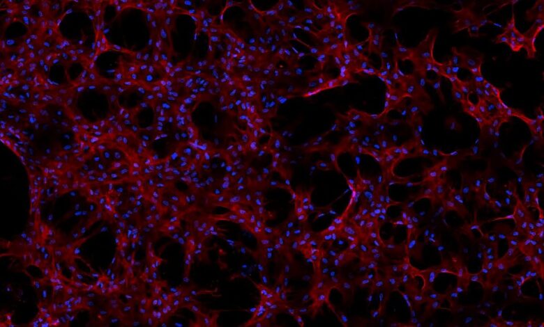 Microscopic view of cells from the lining of blood vessels cultured for the STaARS BioScience-3 experiment.