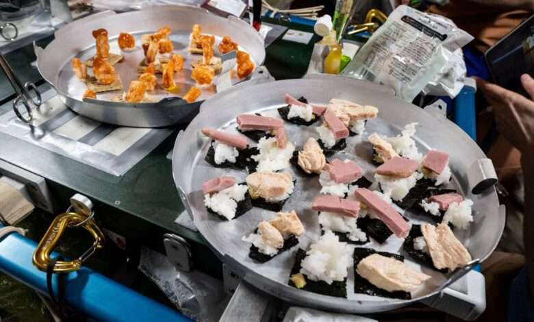 Dinnertime fare on the International Space Station takes center stage in this Aug. 15, 2025, photo. One tray features shrimp cocktail on whole grain wheat crackers, while the other holds sushi made with seaweed, Spam, tuna, and rice. Both trays are secured with Velcro strips to keep them stable inside the Unity module’s galley. The shrimp and crackers are held in place by condiments, while the sushi stays put thanks to surface tension from its moisture.